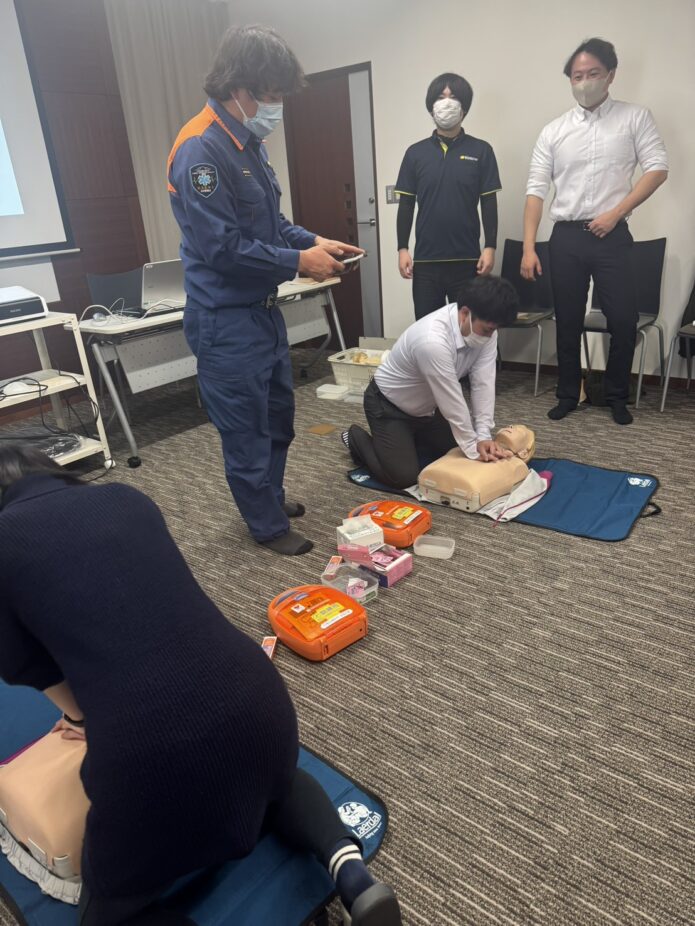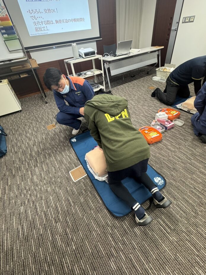 救命処置についての講習を受け、実際に人形を使い胸骨圧迫・人工呼吸・AEDの使い方を学びました。